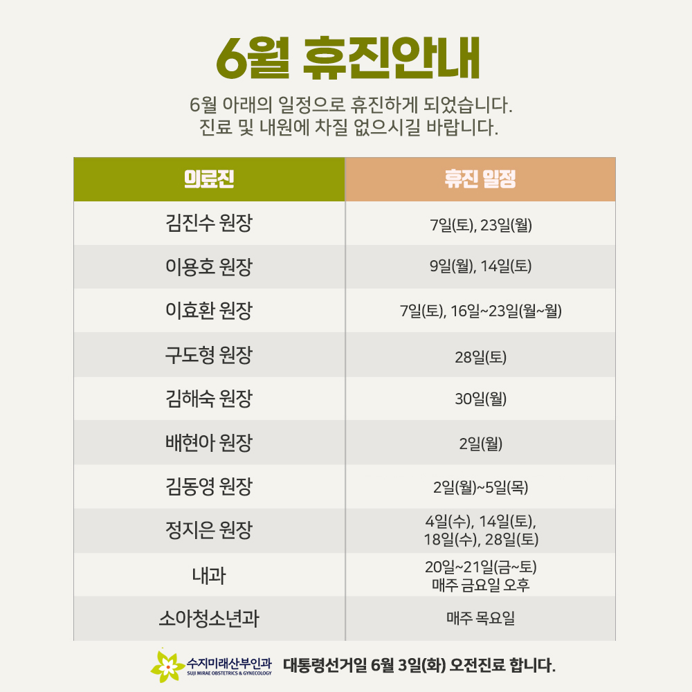 용인산부인과 수지미래산부인과 6월 휴진안내